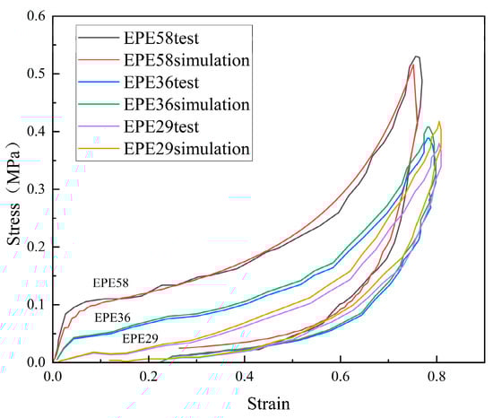 Comparison of stress–strain curves between simulations and compressive tests of PE foam.