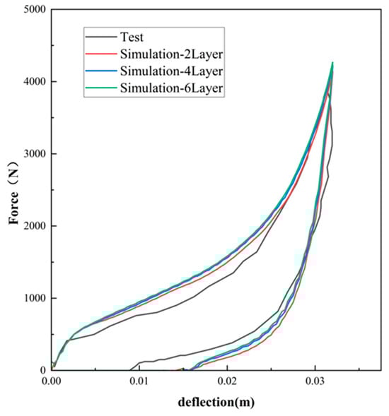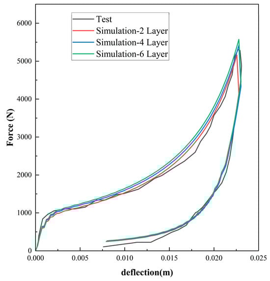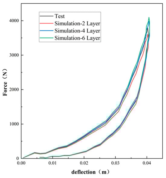 In Abaqus finite element simulations, modeling the foam as a multilayer structure with two performance characteristics superimposed on each other did not mean that more layers were better. Comparing the simulation results of four and six layers, it was found that they basically overlapped, which indicated that the mechanical properties of the foam had already been fully equated at this point, and increasing the number of layers would only increase the unnecessary computational workload without improving the prediction accuracy of the model.