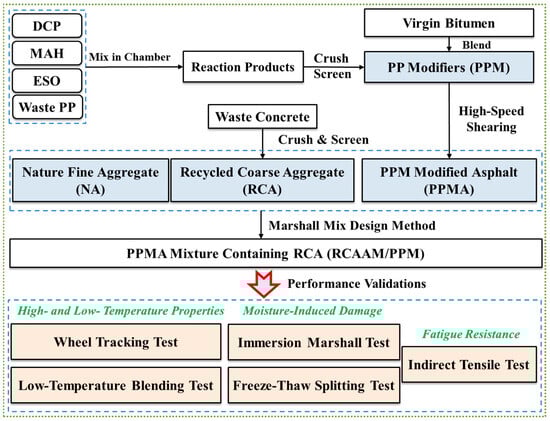 To achieve this goal, this study considers using a thermal-and-mechanochemical method to convert waste PP into high-performance warm-mix asphalt modifiers (PPMs) through a hybrid use of dicumyl peroxide (DCP), maleic anhydride (MAH), and epoxidized soybean oil (ESO) for preparing an asphalt mixture containing RCA (RCAAM). For the prepared RCAAM containing PPMs, the mixing temperature will be decreased by 30 °C as compared to the hot-mix temperature of the RCAAM containing untreated PP. Further, the high-temperature property, low-temperature crack resistance, moisture-induced damage resistance, and fatigue resistance of the RCAAM will be characterized. Figure 1 displays the flowchart of this research plan.