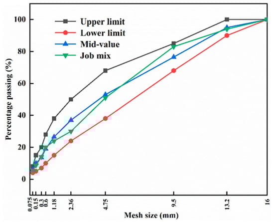 The AC-13 gradation curve for the job mix of the target asphalt mixtures.