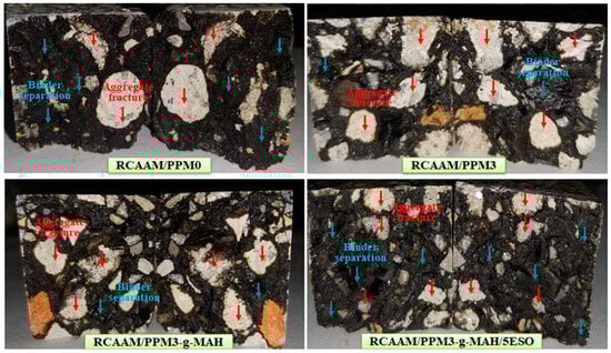 Figure 9 displays the low-temperature fracture macroscopic morphology of the RCAAMs. It is clear that a large amount of asphalt separation and a small amount of RCA fracture occur in the RCAAM/PPM0 sectional structure. The fracture structure of RCAAM/PPM3 and RCAAM/PPM3-g-MAH is very flat and is mainly characterized by aggregate fractures, where the asphalt binder is densely filled in the aggregate skeleton. The results state that PPM3 and PPM3-g-MAH can significantly improve the damage morphology of the asphalt–aggregate interface. This is because the original PPMA binder exhibits brittleness at low temperatures and is more prone to brittle fracture before the breaking of the aggregate when subjected to external loads, while degradation and graft modification can improve the low-temperature flexibility of the PPMA, which causes aggregate failures before the addition of the asphalt binder. Compared to RCAAM/PPM3, the fracture structure of RCAAM/PPM3-g-MAH/5ESO is relatively flat, with asphalt separation and aggregate fracture, which indicates that PPM3-g-MAH/5ESO has the benefit of improving the low-temperature flexibility of RCAAM/PPM0, however, not at the level of PPM3 and PPM3-g-MAH.