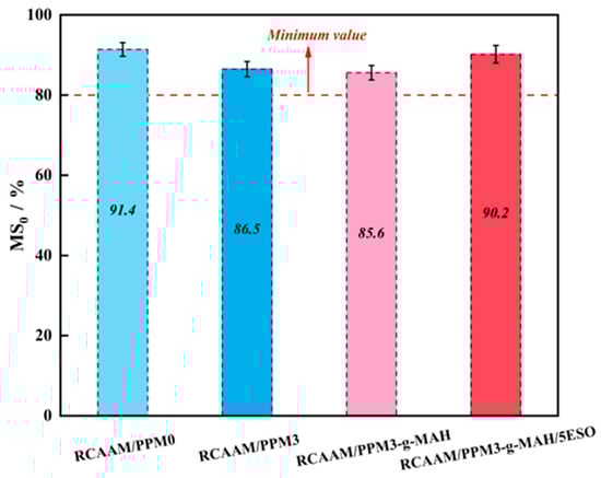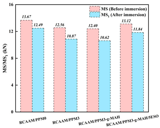 Figure 10 presents the immersion Marshall test results of RCAAMs containing PPMs. It is clear that the Marshall stability of the asphalt mixtures decreases to different degrees after 48 h of immersion in water. It is shown that long-term immersion will reduce the resistance of asphalt mixtures to moisture-induced damage. Compared to RCAAM/PPMA3 and RCAAM/PPMA3-g-MAH, the immersed stability of RCAAM/PPM0 decreases from 12.49 kN to 10.87 kN and 10.62 kN, with decrements of 1.92 kN and 1.87 kN, respectively. When PPMA3-g-MAH/5ESO is used, the initial stability and immersed stability of asphalt mixtures is restored to 13.12 kN and 11.84 kN, respectively. It is demonstrated that after using PPM3 and PPM3-g-MAH, the resistance of RCAAMs to moisture-induced damage decreases, while RCAAM/PPM3-g-MAH/5ESO works almost as well as RCAAM/PPM0.