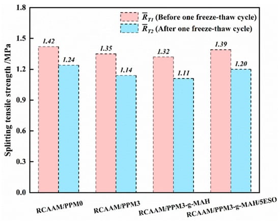 Figure 12 shows the freeze–thaw splitting strength test results of RCAAMs containing PPMs. It is discovered that the freeze–thaw splitting strength of RCAAM/PPM0 is 1.24 MPa, which is 1.09 times and 1.12 times that of RCAAM/PPM3 and RCAAM/PPM3-g-MAH, respectively. After the epoxidation treatment of PPM3-g-MAH by ESO, the splitting strengths of RCAAM/PPM3-g-MAH before and after freeze and thaw recover from 1.32 MPa and 1.11 MPa to 1.39 MPa and 1.20 MPa, respectively, which are close to that of RCAAM/PPM0. It is manifested that the degradation effects of MAH and DCP on waste PP have negative impacts on the freeze–thaw damage resistance of RCAAM/PPM0, but ESO can effectively restore the freeze–thaw damage resistance of RCAAM/PPM3-g-MAH.