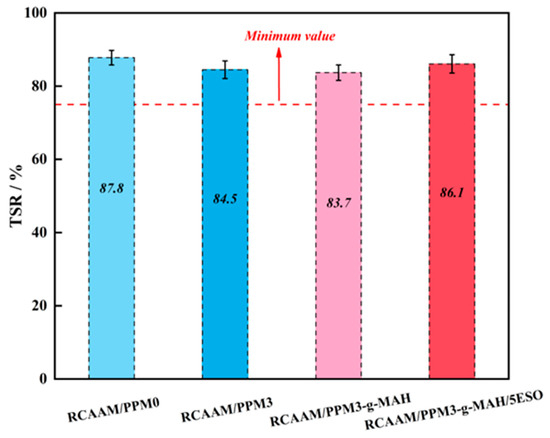 Figure 13 presents the effect of PPMs on the freeze–thaw splitting strength ratio of RCAAMs. It can be found that compared to RCAAM/PPM3, RCAAM/PPM3-g-MAH, and RCAAM/PPM3-g-MAH/5ESO, the TSR value of RCAAM/PPM0 decreases from 87.8% to 84.5%, 83.7%, and 86.1%, which are reductions of 3.3%, 4.1%, and 1.7%, respectively. It is stated that a series of degradation, grafting, and epoxidation pretreatments of waste PP will somewhat reduce the water stability of the modified asphalt mixture. It is worth pointing out that the TSR values of all RCAAMs were higher than 75%, which indicates that these mixtures can satisfy the application requirement of reducing damaging risk after freezing and thawing. In addition, it also illustrated that the different thermo-mechanochemical treatments contribute to decreasing the mixing temperature towards warm mix conditions, which will not result in severe freeze–thaw deterioration of the mixtures.