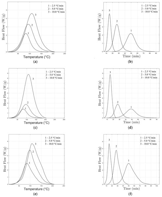 Considering Equation (1), at higher temperatures the rate constant k increases. When the sample reaches the peak temperature, the chemical reaction occurs more rapidly (Figure 1b,d,f,h), resulting in a higher and typically hotter peak.
