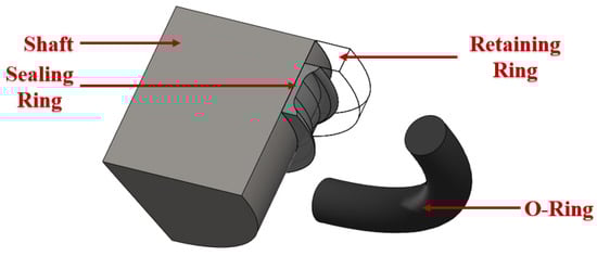 During the operation of a combined seal structure, the distribution of the contact pressure between important friction pairs is critical to the sealing performance. According to the penetration direction of hydraulic oil, the friction pairs (the shaft and the seal ring; the O-ring and the groove structure) were focused on the process of finite element analysis, as shown in Figure 14.