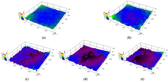 Figure 11. The surface morphology (3D) of NBR specimens at different aging days. (a) Aged for 1 day. (b) Aged for 2 days. (c) Aged for 3 days. (d) Aged for 5 days. (e) Aged for 7 days.
