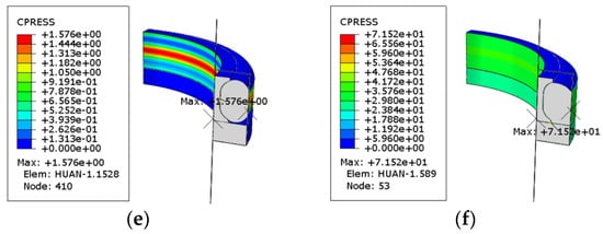 Figure 15. Contact pressure distribution of NBR seals in different testing conditions. (a) Unaged (before oiling); (b) unaged (after oiling); (c) thermal oxidative aging for 3 days (before oiling); (d) thermal oxidative aging for 3 days (after oiling); (e) oil aging for 3 days (before oiling); (f) oil aging for 3 days (after oiling).