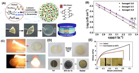 (A) (Top) Schematic illustration of the synthesis of PIL-UPy ionogel, (bottom) photographs demonstrating the resulting ionogel and its flexibility along with the schematic assembly of the Li-ion batteries; (B) evolution of the ionic conductivity as function of the temperature with different molar fractions between [DEIM+][TFSI−] and IL-UPy units (e.g., 3/3.5/4); (C) photographs illustrating the exposition to the fire of Ionogel−3.5 and commercial Celgard soaked with electrolyte; (D) photographs exhibiting the self-healing capability of the ionogel and (E) the stress–strain curves of as-prepared and healed ionogel. Reproduced with permission from [33]. Copyright 2019, American Chemical Society.