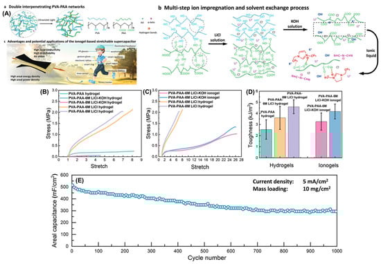 (A) Synthetic route of ionogel: (a) synthesis of PVA-PAA double network, (b) formation of DN hydrogel by soaking in LiCl/KOH aqueous solution and drying of the gel followed by the formation of DN ionogel by soaking in [EMI+][DCA−] ionic liquid, (c) advantages and application of ionogel based stretchable supercapacitor; (B) stress–stretch curves of intermediate DN hydrogels as function of electrolyte concentration; (C) stress–stretch curves of DN ionogels; (D) comparison of toughness of different involved gels; (E) cycling stability of the resulting SC using prepared ionogel at 5 mA cm−2. Reproduced with permission from [91]. Copyright 2023, Wiley.