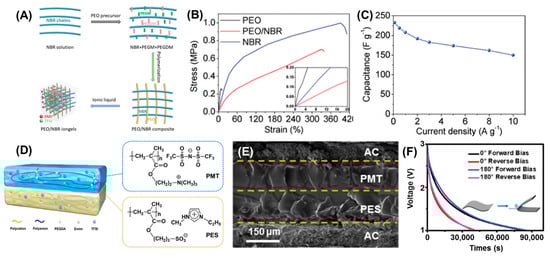 (A) Synthetic route to produce PEO/NBR ionogel; (B) stress–strain curve of PEO, NBR, and the prepared PEO/NBR ionogel; (C) evolution of the specific capacitance as function of the discharging current density. Reproduced with permission from [95]. Copyright 2019, Royal Society of Chemistry. (D) Bilayer ionogel based on PMT and PES; (E) SEM cross section of the SC cell; (F) Self-discharge profile of the bilayer ionogel with planar and folded at 180° configuration and under forward/reverse bias. Reproduced with permission from [102]. Copyright 2023, Royal Society of Chemistry.