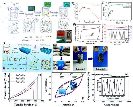 (A) Synthetic pathway to prepare PAM/PAA dual crosslinked network; (B) evolution of the ionic conductivity and (C) stress–strain curves of the GPE as function of the ratio of the two monomers; (D) voltammograms of the flexible SC at different bending angles; (E) cycling stability of the SC. Reproduced with permission from [111]. Copyright 2020, Wiley. (F) Scheme illustrating the formation of PVA/PHEAA double network hydrogel; (G) photographs presenting the flexibility and stretchability of the gel; (H) stress–strain curves of DN gels with different wt.% of HEAA monomer (25, 30, 35 wt.%); (I) voltammograms of the optimized DN hydrogels at different bending angle up to 180° and (J) cycling stability of the gel. Reproduced with permission from [113]. Copyright 2022, Royal Society of Chemistry.