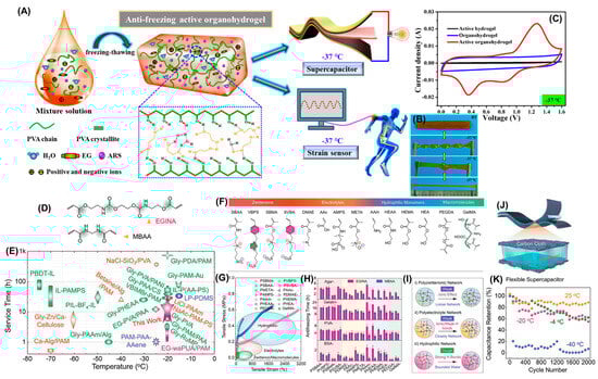 (A) Scheme illustrating the formation of PVA organo-hydrogel using EG/H2O binary solvent and its potential applications in supercapacitor and strain sensor; (B) photographs showing the flexibility and stretchability of the organo-hydrogel at −37 °C; (C) voltammograms of the assembled SC at −37 °C using different gel electrolyte. Reproduced with permission from [128]. Copyright 2021, American Chemical Society. (D) Chemical structure of MBAA (N,N′-methylenebisacrylamide) and EGINA (4,9-dioxo−5,8-dioxa−3,10-diazadodecane−1,12-diyl diacrylate); (E) positioning of the reported anti-freezing hydrogel using EGINA crosslinker compared to other reported systems in terms of service time and temperature; (F) different monomer structures used to synthetize anti-freezing hydrogels; (G) stress–strain relation and (H) anti-freezing time of hydrogel resulted from monomers reported in (F); (I) possible interactions within the GPE; (J) scheme of the SC devices and (K) capacitance retention over 2000 GCD cycles at different temperatures. Reproduced with permission from [133]. Copyright 2021, Wiley.