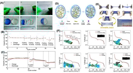 (A) The PZM hydrogel: (top) (i,ii) before–after stretching and (iii) twisting; (bottom) (i) two pieces of PZM gel (one colored in blue for visuality), (ii) two-half parts and (iii) self-healed PZM gel; (B) evolution of the capacity as function of cycle number and folding cycles; and (C) evolution of the capacity as function of the cycle number and healing cycles. Reproduced with permission from [31]. Copyright 2022, Royal Society of Chemistry. (D) Formation of the PAAm hydrogel; (E) photographs displaying the mechanical properties of the hydrogel (flexible, stretchable); (F) the polarization curves of the assembled Zn-MnO2 battery under mechanical constraints. Reproduced with permission from [144]. Copyright 2019, Elsevier.