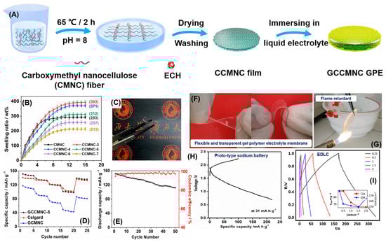 (A) Schematic procedure for synthetizing GCCMNC GPE; (B) electrolyte uptake and swelling of the gel with different thicknesses; (C) photograph of the flexible film; (D) evolution of the discharge capacity as function of the C-rate (0.2, 0.5, 1, 2C) and of the cycle number; (E) cycling stability of the Li/GCMNC−5 GPE/NCM523 cell at 0.2C. Reproduced with permission from [150]. Copyright 2022, Elsevier. (F) Photographs of PVdF-HFP/NaPF6/TMP organogel showing the flexibility of the GPE; (G) flame-retardant characteristic of the GPE; (H) polarization curve of Li/GPE/LFP cell at 31 mA g−1; and (I) galvanostatic charge–discharge curves of the SC with inset figure the evolution of the specific capacitance as function of the current density. Reproduced with permission from [152]. Copyright 2022, Elsevier.