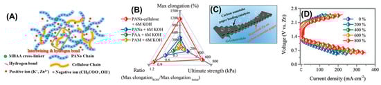 (A) Schematic representation of PANa/cellulose hydrogel; (B) radar chart representing the mechanical characteristics of the hydrogels in function of their compositions; (C) Schematic representation of the flexible Zn-air battery; (D) polarization curves at different elongations of Zn-air battery using PANa/cellulose/6 M KOH hydrogel as GPE. Reproduced with permission from [22]. Copyright 2019, Wiley.