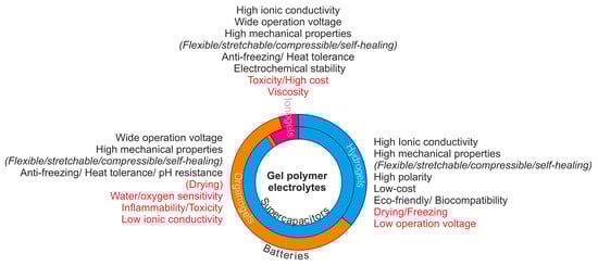 With the increasing demand for foldable, flexible, and wearable electronics to respond to the emerging era of Internet-of-Things (IoTs), the development of highly efficient, flexible, and deformable energy supply systems is becoming one of the keys to unlocking the realm of these electronic devices. At the current state, batteries and supercapacitors are two main categories of energy storage systems that could be suitable for this purpose, working mainly on three distinct mechanisms: the electrostatic adsorption of ions (EDLC mechanism), the non-capacitive Faradaic or Nernstian mechanism, and the pseudocapacitive charge storage mechanism. A combination of these storage pathways leads to different types of electrochemical storage devices, including batteries [1,2,3], EDL capacitors [4], pseudocapacitors [5], hybrid electrochemical capacitors [6], and supercabatteries [7]. Depending on the type of system, they can provide high energy. high power or both. Nevertheless, independent of their names and operation mechanisms, these systems share the same cell configuration, including an electrolyte (and/or polymeric separator) in a sandwich between two electrodes (positrode and negatrode). While a large library of active electrode materials has been significantly developed, the electrolytes have remained humbler in their developments with the traditional use of salts dissolved in solvent (water, acetonitrile, carbonate-based organic solvents, etc.), or ionic liquid and deep eutectic solvents [8]. Despite developing high-performing systems, they will never be applied in such devices as liquid electrolytes cannot be free-standing, and under mechanical constraints, the liquid electrolyte will generate enormous pressure on the encapsulation layer, increasing the risk of the cell’s burst. Moreover, they face major issues for deformable/wearable devices due to the low operation voltage (water), the risk of electrolyte leakage, inflammability (organic solvents), and toxicity (ionic liquid/deep eutectic/organic solvents). In light of this situation, all-solid-state or quasi-solid-state electrolytes are required to have electrochemical storage systems that have appropriate safety and mechanical properties. Thus, freestanding polymer electrolytes allow them to bring excellent flexibility, compressibility, stretchability, and self-healing properties to energy storage systems. However, imprisoning ions within a solid structure reduces their mobility and thus, reduces the ionic conductivity of the electrolyte (several orders of magnitude) [9]. Therefore, the above gains are counter-balanced to the detriment of the electrochemical performance. Among candidates, gel polymer electrolytes (GPEs: ionogel, hydrogels, organogels) emerge as promising candidates to ensure the mechanical properties of the devices while allowing the ions to circulate within their structure [10]. Typically, one or more polymer networks are adopted in the GPEs as a host matrix for electrolytes, providing high mechanical integrity. Indeed, a high-performant GPE must satisfy specific requirements for both polymer framework and electrolyte. Concerning polymer host, the key requirements rely on (1) local relaxation and segmental motion of polymer chains [11]; (2) the presence of functional groups promoting dissociation of salts [12]; (3) low glass transition temperature [13]; (4) high thermal stability, and (5) wide electrochemical window to increase the energy density. Concerning the guest electrolytes/solvents, they need to have [14,15,16]: (1) thermal/electrochemical stability, (2) high dielectric constant, (3) low vapor phase pression to prevent drying of the GPEs, (4) salts with large anions and low ion pair dissociation energy barrier to prevent the formation of ion aggregation, yielding high ionic conductivity. In addition to the aforementioned criteria, other dimensions, such as mechanical constraints and thermoresponsibility, need to be included in the conception of good GPE for flexible, stretchable, deformable devices.
