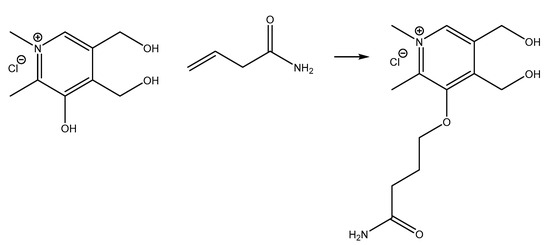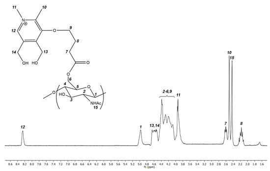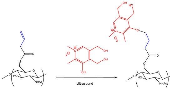 Alkene chitin derivative (0.5 g) was dissolved in water (50 mL) with vigorous stirring at 70 °C and then the solution was slowly cooled to 20 °C. Then, 0.15, 0,45, or 0.65 equiv. of N-methyl pyridoxine chloride and 0.1 equiv. of DMAP were added to the solution. The resultant mixture was sonicated at 44 kHz, 200 W for 20–25 min. The formed polymers were precipitated by ethanol (100 mL), washed with ethanol (50 mL, three times), and dried in vacuum.