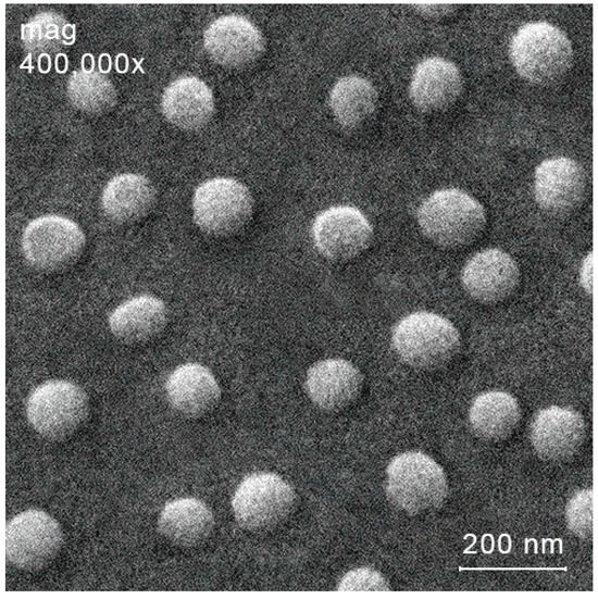 The resulting nanoparticles are characterized by a unimodal size distribution and spherical morphology, which was also confirmed using scanning electron microscopy (SEM). As an example, an SEM image of the most biologically active nanoparticles (see Section 3.4) NP-3-III is presented in Figure 3.