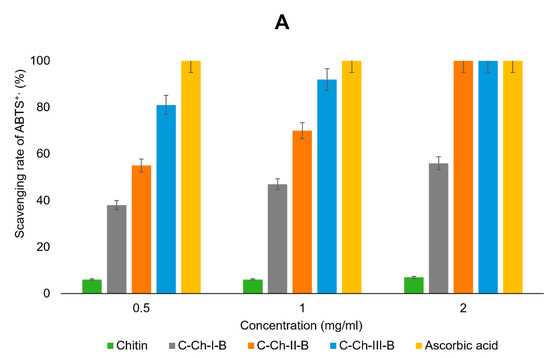 At a concentration of 0.5 mg/mL, only ascorbic acid is capable of scavenging 100% of ABTS+• radical cations and it demonstrates the most powerful antioxidant effect. Starting chitin at the same concentration exhibits the least antioxidant effect (ABTS+• radical cation capture about 6%). The extremely low effect of chitin can be explained by its complete insolubility in water. Chitin derivatives have a greater antioxidant effect than the starting polymer (Figure 4A). Their antioxidant activity increases with increasing degree of substitution (ABTS+• radical cation capture of about 38% for C-Ch-I-B, about 55% for C-Ch-II-B, and about 81% for C-Ch-III-B). The same patterns of the antioxidant activity of polymers depending on the degree of substitution are also observed for other sample concentrations. An increase in the concentration of samples naturally results in an increase in their antioxidant activity. For example, at a concentration of 1 mg/mL, C-Ch-III-B is able to capture 92% of ABTS+• radical cations; when the concentration of C-Ch-III-B increases to 2 mg/mL, the capture efficiency increases to 100%.