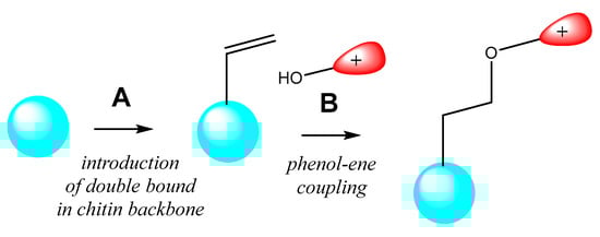 Cationic chitin derivatives are known for their significant antibacterial activity, offering a potential alternative to traditional antibiotics [14,18]. In this work, we propose that introducing an alkene function into the chitin molecule (Scheme 1A) and subsequently performing a phenol-ene reaction with a cationic phenolic compound (Scheme 1B) will enable the synthesis of cationic chitin derivatives with antibacterial properties.