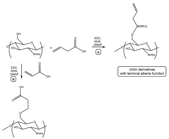 Chitin (0.5 g) and lithium chloride (1.4 g) were placed into a vial loaded with a magnetic stirrer bar and the vial was sealed. Next, 30 mL of dry DMAA was injected into the vial and the mixture was purged by dry nitrogen. The mixture was stirred at 20 °C for 3 h to give a pale yellow transparent viscous solution of chitin. Then the vial was opened with a decapper. Then, 0.2, 0.7, or 1 equiv. of but-3-enoic acid, NHS, and EDC, and 0.1 equiv. of DMAP were added to the chitin solution and the reaction mixture was stirred for 3 h at 50 °C. The formed polymers were precipitated by acetone, washed by acetone and ethanol, and dried under vacuum.
