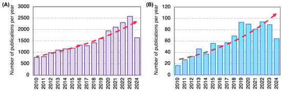 Number of scientific papers per year from 2010 to June 2024. (A) Publications on “Wound dressing”. (B) Publications on “Core-shell nanofiber”.