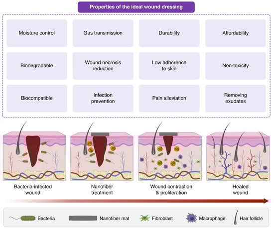 Properties of the ideal wound dressing. The bottom illustration shows the process of wound healing, containing bacteria-infected wounds, treatment with nanofibers, wound contraction and proliferation, and healed wounds. (Reproduced from ref. [33] with permission from Elsevier).