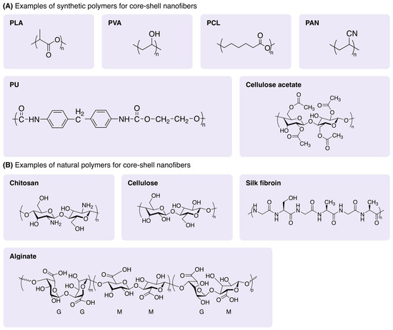 Chemical structures of the common polymers used in core-shell nanofibers. (A) Synthetic polymers. (B) Natural polymers.