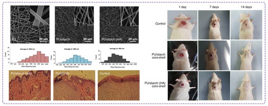 In a recent report by Movahei et al. [142], core-shell nanofibers based on PU, starch, and HA were developed using the coaxial electrospinning method for wound dressing application (Figure 8). PU was selected to form the core layer referring to its good mechanical properties, and the shell was made of starch and HA for better biocompatibility and hydrophilicity. The MTT assay indicated cell viability rates above 80% after seven days of incubation for all scaffolds, confirming their non-cytotoxic nature. Microscopic images revealed that cell proliferation on PU/starch and PU/starch/HA nanofibers was significantly higher than on pure PU scaffolds after one and four days. Moreover, the quantitative results from in vitro tests indicated that the cell viability increased from day one to day seven. The PU/starch/HA nanofibers indicated an absorbance of 1.75 at 490 nm on day seven compared to 1.25 for PU/starch and 0.95 for PU scaffolds, demonstrating enhanced cell viability and proliferation. Using a rat model, this team investigated an in vivo wound healing efficacy as well. Wounds treated with PU/starch/HA scaffolds demonstrated the highest healing rate, with approximately 80% wound closure by day 14 compared to 65% for PU/starch. Histological analysis revealed that the PU/starch/HA treated wounds showed a well-developed dermis, the presence of hair follicles, and sebaceous glands, indicating superior tissue regeneration. The number of inflammatory cells was significantly lower in the PU/starch/HA group, highlighting its effectiveness in reducing inflammation and promoting faster healing.