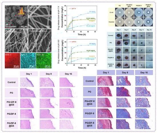 SEM images of ZIF-8 nanoparticles and PAN/gelatin (PG) nanofibers doped with ZIF-8 nanoparticles. The wound repair efficacy of the prepared nanofibers is evaluated by investigating drug release profile, antibacterial activity, in vivo wound record on rats, and H&E staining and Masson staining of wound tissue on different days. (Reproduced from ref. [154] with permission from Elsevier).