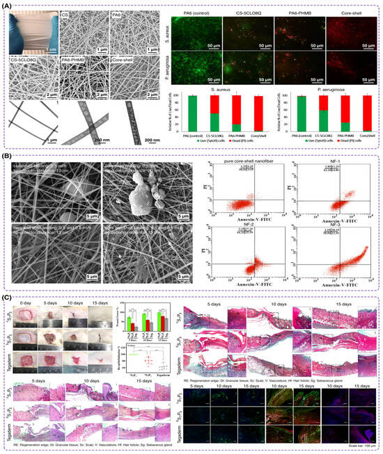 In a work conducted by Keirouz et al. [165], a core-shell nanofiber based on nylon-6 and chitosan was developed to prohibit mesh-associated surgical site infections (Figure 10A). They utilized chitosan due to its polycationic nature, which allows it to permeabilize bacterial cell walls and therefore osmotic imbalances and inhibit bacterial growth. Using the coaxial electrospinning method, they considered a core-shell structure with nylon-6 at the core and a chitosan/PEO shell for antimicrobial action. The addition of PEO improved the electrospinnability of chitosan by reducing the repulsion between the polymer chains, leading to the production of uniform fibers. This study is significant due to the inhibition of the growth of both Gram-positive and Gram-negative bacteria, as well as controlled drug release. The controlled drug release enhances the antimicrobial efficacy over a prolonged period, which is vital for ideal wound dressing and infection control. In another report by Hasanbegloo et al. [166], chitosan was used as the core containing paclitaxel-loaded liposomes to enhance the functional properties of the nanofibers, providing a sustained and controlled release of the drug (Figure 10B). The core was supported by PCL, using the coaxial electrospinning technique. They showed that chitosan/PCL core-shell nanofibers improved wound healing due to the antimicrobial activity of loaded chitosan. In vitro cytotoxicity studies showed that liposome-loaded core-shell nanofibers resulted in more than 85% cancer cell death after 168 h, compared to 57% for simple chitosan nanofibers. Additionally, in vivo results indicated a reduction in tumor weight from 1.35 g to 0.65 g using this functionalized core-shell nanofiber, demonstrating the potential for effective localized drug delivery and enhanced wound healing.