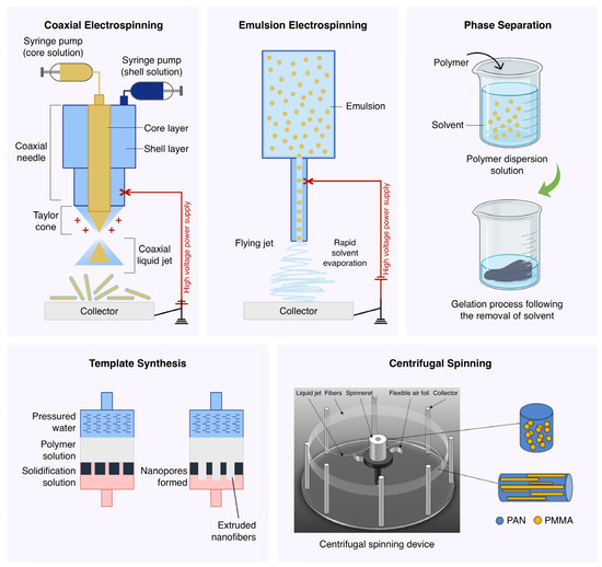 Hollow nanofibers are produced through advanced fabrication methods such as coaxial electrospinning, template-assisted techniques, and self-assembly processes. As a common synthesis method, coaxial electrospinning involves the extrusion of two polymer solutions through a coaxial needle, creating a composite fiber that has a core-shell configuration [100]. The outer polymer solution forms the shell, whereas the inner solution constitutes the core and then is removed, resulting in a hollow fiber morphology. Alternatively, hollow nanofibers can be fabricated using sacrificial templates.