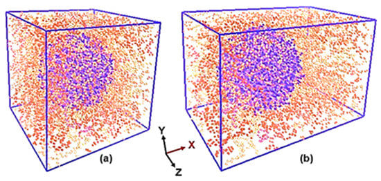 To further enrich the investigation, the study implemented a new method to directly examine local deformation fields at the atomic level [75,76]. This approach allows us to calculate the deformation gradient for every atom using an intricate minimization problem. Valuable information about the distribution of local strain fields in the atomistic model was obtained by analyzing the positions of the atom of interest and its neighboring atoms within the specified cutoff radius (). The Lagrange Green strain tensor, which is defined in relation to the reference coordinates, played a vital role in the evaluation and analysis of these localized strain fields. More information about the calculation of the local, per-atom-defined deformation (strain) can be found in our previous works [11,77].