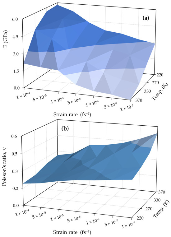 To enhance clarity, a focused analysis was performed on the changes in the Young’s modulus and Poisson’s ratio with respect to the strain rate across several temperature ranges: below, at, and above the glassy transition point, as described in Section 3.1.1. Furthermore, in Section 3.1.2, the dependence of the Young’s modulus and Poisson’s ratio on temperature were analyzed using consistent and distinct strain rate values. In a 2D analysis, complexities are reduced, making it easier to apply theoretical/analytical frameworks and equations derived from previous research [32,33].