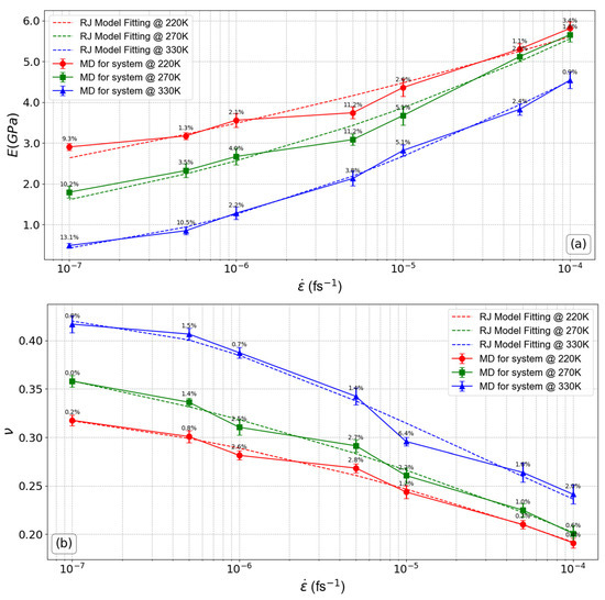 Linear mechanical properties of the PEO/SiO2 nanocomposites model as a function of strain rate: (a) Young’s modulus, (b) Poisson’s ratio. The error bars are computed by analyzing ten uncorrelated configurations. The percentage error values between the MD simulation results and the RJ model are displayed above each data point on the plot.