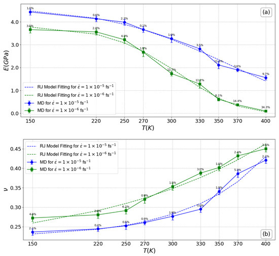 Linear mechanical properties of the PEO/SiO2 nanocomposite model as a function of temperature: (a) Young’s modulus, (b) Poison’s ratio. The error bars are computed by analyzing ten uncorrelated configurations. The percentage error values between the MD simulation results and the RJ model are displayed above each data point on the plot.