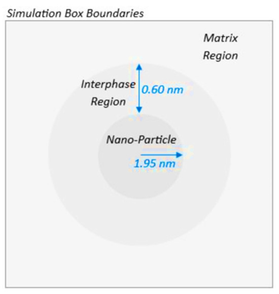 To investigate the heterogeneous mechanical characteristics exhibited by the PEO/SiO2 model systems, a thorough examination of the stress and strain fields at the atomic scale is imperative. To accomplish this, a per-atom assessment of stress and strain is employed, applied within the framework of a globally imposed strain. The computation of local stress at each individual atom, as mentioned above, is performed directly using the principles of the atomic virial formalism. Based on our previous research on polymer/silica nanocomposites [11], the determination of the extent of the interphase region surrounding the nanoparticle is based on data related to the density profile of the PEO chains with respect to their distance from the center of mass of the silica nanoparticle. As described in our previous works [11,72], it was found that the interphase region extends to a distance of 6.0 Å from the surface of the silica nanoparticle, coinciding with the initial dip observed in the density-radial distance curve. Following this, the matrix region is identified, beginning at the end of the interphase region. In this study, the matrix region is defined as the remaining polymers surrounding the interphase region (Figure 5). Based on the aforementioned statement, the calculation of stress within a particular domain, such as the PEO/SiO2 interface and the PEO matrix, involves the sum of individual contributions of each atom within the domain, followed by the division of this amount by the volume of the domain; the latter is due to the fact that the values of the atom array are in ‘pressure times volume’.