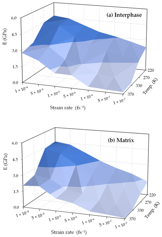 Figure 6 shows a three-dimensional (3D) visualization that illustrates the modulus of changes in elasticity in the interphase and matrix regions, revealing how they are influenced by temperature and strain rate. For better clarification, changes in the Young’s modulus for the interphase and matrix regions are analyzed based on the strain rate and temperature in Section 3.2.1 and Section 3.2.2, respectively.