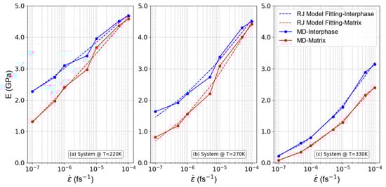 To examine the behavior of the PEO/SiO2 nanocomposite system under varying strain rates, a comprehensive examination was carried out in three different temperatures chosen with respect to the average glass transition temperature, , of the model PEO/SiO2 systems: (a) below (220 K), (b) equal to (270 K), and (c) above (330 K) the . The resulting observations related to the elastic modulus in relation to the applied strain rate (graphed on a logarithmic scale) for these three distinct systems are visually presented in Figure 7. Furthermore, the graphs depicted the results derived from the RJ model, illustrating a strong similarity between the model results and those produced by the MD simulations, thus supporting our findings.