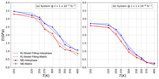 Based on the information provided in Figure 4a, it is feasible to draw the conclusion that a slight change in the Young’s modulus was observed within the temperature range of 150 K to nearly 270 K (which is equivalent to , the glass transition temperature). This is due to the restricted molecular mobility of the polymer chains as a result of the low thermal expansion and stiffer material below the glass transition temperature (). However, as the temperature approaches this threshold, the Young’s modulus begins to decrease in a detectable manner, particularly when the material is subjected to low strain rates. For example, at a strain rate of 1.0 × 10−5 fs−1, the percentage decrease in the Young’s modulus increases from 6.69% to 64.79% as the temperature rises from 220 K to 400 K, compared to the system at 150 K. Similarly, at a strain rate of 1.0 × 10−6 fs−1, the percentage decrease reaches up to 97.24% at 400 K. This trend shows that the effect of temperature on the material’s modulus becomes more pronounced at lower strain rates. Specifically, while the percentage decrease is moderate at lower temperatures, it escalates significantly at higher temperatures. This indicates that as the material approaches its melt state, the impact of temperature on reducing its modulus becomes more evident and pronounced, with higher strain rates accelerating the reduction in mechanical stiffness. Consequently, higher thermal expansion and lower modulus occur above due to reduced intermolecular forces and enhanced molecular mobility. The alignment between the results derived from the application of the RJ model and those obtained through the MD simulation is notably evident. In this specific case, the Weibull modulus values are 4.3 and 6.2 for systems subjected to strain rates of 1.0 × 10−5 fs−1 and 1.0 × 10−6 fs−1, respectively, as demonstrated in Table 2. This concordance underscores the reliability and consistency of the RJ model in capturing the mechanical behavior of systems under varying strain rates. On the contrary, Figure 3b shows the opposite trend. With increasing temperature, the Poisson’s ratio starts to increase and is consistently higher for the system at the lower strain rate of 1.0 × 10−6 fs−1 throughout the entire temperature range, indicating greater ductility. At a strain rate of 1.0 × 10−5 fs−1, the ratio increases from 10.19% at 270 K to 77.82% at 400 K compared to its value at 150 K. At a strain rate of 1.0 × 10−6, the ratio increases from 17.66% at 270 K to 65.13% at 400 K. The increase in the Poisson’s ratio at higher strain rates is not abrupt, suggesting a limited lateral deformation of the material, indicating that it becomes stiffer at high strain rates. This contrasts with the behavior observed at lower strain rates. Furthermore, it is apparent how closely the results of the Poisson ratio derived from the RJ model align with those from MD simulations.