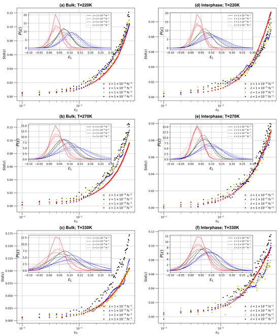 Next, a detailed investigation is provided on how the local strain distribution evolves across different strain rates and temperatures within the PEO/SiO2 nanocomposite system, shedding light on the spatial variation and rate dependence of mechanical properties within the material. The heterogeneities of local stress and strain fields are examined for specific values of the applied global deformation, that is, strain values of 0.03, 0.06, and 0.09, each representing a specific frame within the elastic regime. The strain probability distribution function, P(ε), is computed for these strain values for both interphase and bulk regions. Data about the standard deviations of P(ε) for the interface and the matrix regions are presented in Figure 9, whereas in the inset, the entire P(ε) is shown. Systems at 220 K, 270 K, and 330 K are shown. The P(ε) data show the varying levels of strain heterogeneity that occur under different conditions, while the standard deviation curves offer information on the degree of variation in local strain within the material. It is clear that the local strain distributions are symmetrical, with initially narrow peaks signifying extensive adaptation to the global strain. As the strain increases, these distributions become more extensive, suggesting the presence of a more varied local strain field within the polymer. The significant fluctuations and variations observed in the standard deviation can be attributed to the heterogeneity present in the local strain distribution.