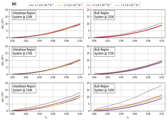 Variation in the mean-squared displacement (a) along x-direction and (b) for all components (sum of MSD along x, y, and z directions) in the interphase and matrix regions as a function of global applied strain under different strain rates, for systems at temperatures below (220 K), at (270 K), and above (330 K) the glass transition temperature ().
