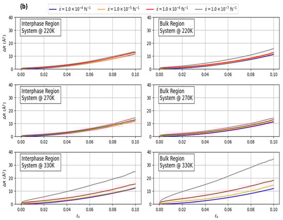 Based on Figure 10a, the polymer mobility in the axial direction during uniaxial deformation is significantly influenced by the temperature of the system, particularly in relation to the glass transition temperature (). For temperatures at or below , where the polymer exists in a glassy state, the effect of varying strain rates on polymer motion in the interphase regions is minimal. This indicates that the polymer chains in these regions are relatively rigid, limiting their mobility regardless of the strain rate. However, when the temperature exceeds , transitioning the polymer into a molten state, the impact of strain rate becomes more pronounced. In these higher temperature conditions, the matrix or bulk-like region exhibits a much larger disparity in MSD values at lower strain rates, particularly at 1.0 × 10−7 fs−1, compared to other strain rates. This suggests that at elevated temperatures and lower strain rates, the polymer chains in the matrix region have greater mobility, which could be due to the reduced viscosity and increased chain flexibility (entropic effect) in the molten state. Consequently, higher temperatures coupled with lower strain rates result in significantly increased MSD, with the matrix region showing a more pronounced response compared to the interphase region (enthalpic effect). This behavior highlights the complex interplay between temperature, strain rate, and polymer mobility, particularly across different regions of the polymer composite.