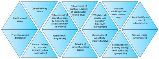 In the last decade, there has been a growing interest in the use of biodegradable polymeric nanoparticles (BPNPs) as drug carriers [,,,,]. Polymeric carriers have many beneficial properties that improve the effectiveness of conventional drug therapies. Polymeric nanoparticles, like other nanomaterials used in biomedicine, have unique properties resulting from their nanometric size. These include an improved dissolution kinetics of encapsulated drugs that are mostly poorly or not at all soluble in water in crystalline form []. Drug molecules incorporated, encapsulated or adsorbed onto polymer matrices are better protected against degradation in physiological fluids []. Appropriate chemical modification of the surface of polymeric nanoparticles ensures controlled (slowed, accelerated) release of the drug at the target site []. The release of the drug can be initiated by various stimuli such as light, pH, magnetic field or temperature []. In addition, it is possible to attach ligands for receptors that are overexpressed, for example on the surface of cancer cells [,]. In this way, after delivering an as-prepared anticancer drug-loaded nanocarrier to the body, it is possible to direct the drug molecule to cancer cells and significantly reduce side effects for the entire body. Therefore, it seems that therapy with the use of nanoparticles is safer, as it allows one to reduce the dose of the drug delivered to the patient, ensures its local effect, and reduces the side effects of drugs that are usually characterized by significant toxicity []. The diversity of polymeric matrices makes it possible to use them as carriers for both hydrophilic and hydrophobic drugs []. The enormous progress made in recent years in the methods of polymer nanoparticle fabrication makes it possible to control their chemical composition, particle size and surface charge []. This, in turn, determines such features of the nanocarrier as biocompatibility, biodegradability, affinity for cells and distribution in the body. Not without significance for use as attractive drug carriers are also the excellent mechanical properties of most polymeric materials, including their flexibility and durability []. BPNPs are also effective drug carriers for oral administration []. In this case, they can provide protection against the breakdown of sensitive drugs in the harsh conditions of the gastrointestinal tract, as well as contributing to prolonging their residence in the intestines. These and other benefits of using polymeric nanoparticles as drug carriers are shown in Figure 1.