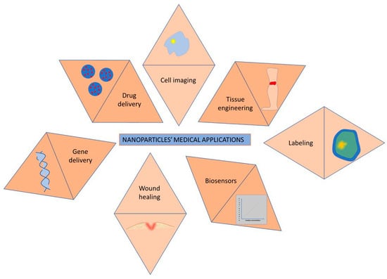 Nanomaterials have found many applications in the field of medicine. Thus polymer nanoparticles are used, among other applications, in tissue regeneration [], gene delivery [], drug delivery [], wound healing [], biosensing [], labeling [] and bioimaging [], as schematically presented in Figure 3.