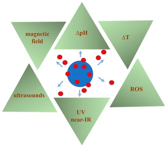 Stimuli causing the release of encapsulated/adsorbed drug from polymeric nanoparticles (ROS—reactive oxygen species, ∆T—temperature change).
