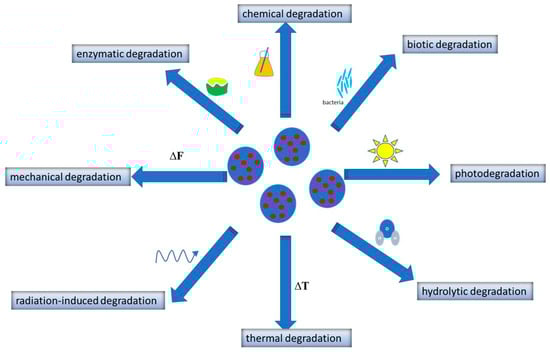 Under the influence of these factors, changes occur in the polymeric composition, molecular weight, and chemical and structural properties. Depending on the factor responsible for degradation, hydrolytic, photochemical, oxidative, thermal, radiation-induced or microbial decomposition can be distinguished []. Usually, many degradation mechanisms occur simultaneously, so it is a difficult process to predict.