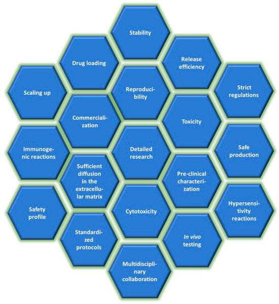 There is an increasing interest in the application of BPNPs in nanomedicine. They offer great potential utility as the carriers in DDSs [,,,]. Polymeric nanoparticles can be used to deliver many types of drugs [,,,,,]. Multi-drug delivery is also possible [,,]. Additionally, drug release can be triggered by numerous stimuli [,]. This allows for stimulus-dependent controlled and targeted release, the minimization of side effects and the improvement of therapeutic efficacy. Biodegradable polymers are very attractive drug carriers with merits of biocompatibility and biodegradability [,,,,,]. They seem to be easily eliminated from the body, which makes them excellent candidates to be used as the matrices in nanoformulations [,,]. However, before the successful clinical application of BPNPs, several issues need to be addressed. The successful clinical usage of BPNPs is limited by various drawbacks such as changes in the nanoparticle physicochemical properties (nanoparticle size, aggregation, surface charge), premature drug release, insufficient drug encapsulation efficiency, problems with achieving the desired drug release profile, and improper distribution in the body [,,]. The challenges for researchers working on pharmaceutical formulations based on BPNPs are shown in Figure 6.