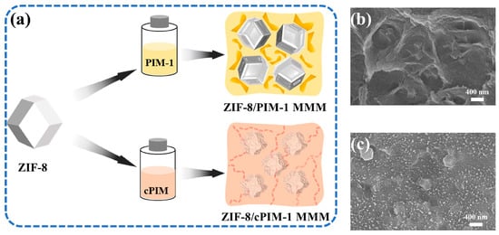 (a) Illustration of ZIF-8/PIM-1 and ZIF-8/cPIM membranes. Cross-sectional SEM images of ZIF-8/PIM-1 (b) and ZIF-8/cPIM (c) membranes at the same magnification, and with a ZIF-8 loading of 20 wt%, demonstrate their two distinct composite morphologies.